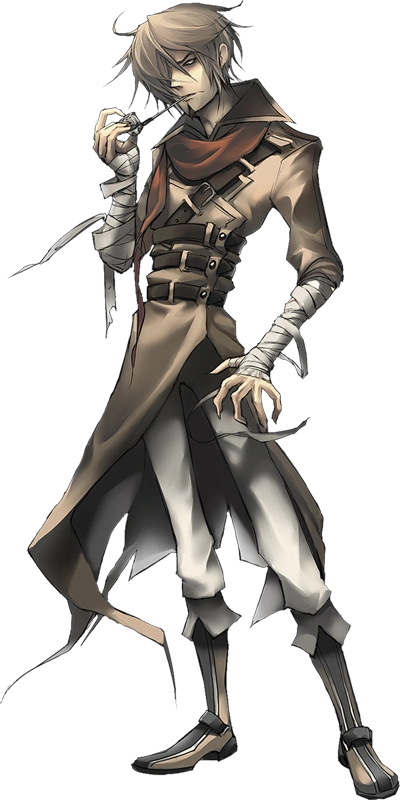 Vestimenta: Tiene vendas en sus brazos y en el tórax. Tiene una bufanda harapienta de color carmesí. De estilo militar, un abrigo negro ligeramente rasgada en una capa. Pantalones blancos hasta la rodilla y botas hasta la pantorrilla.