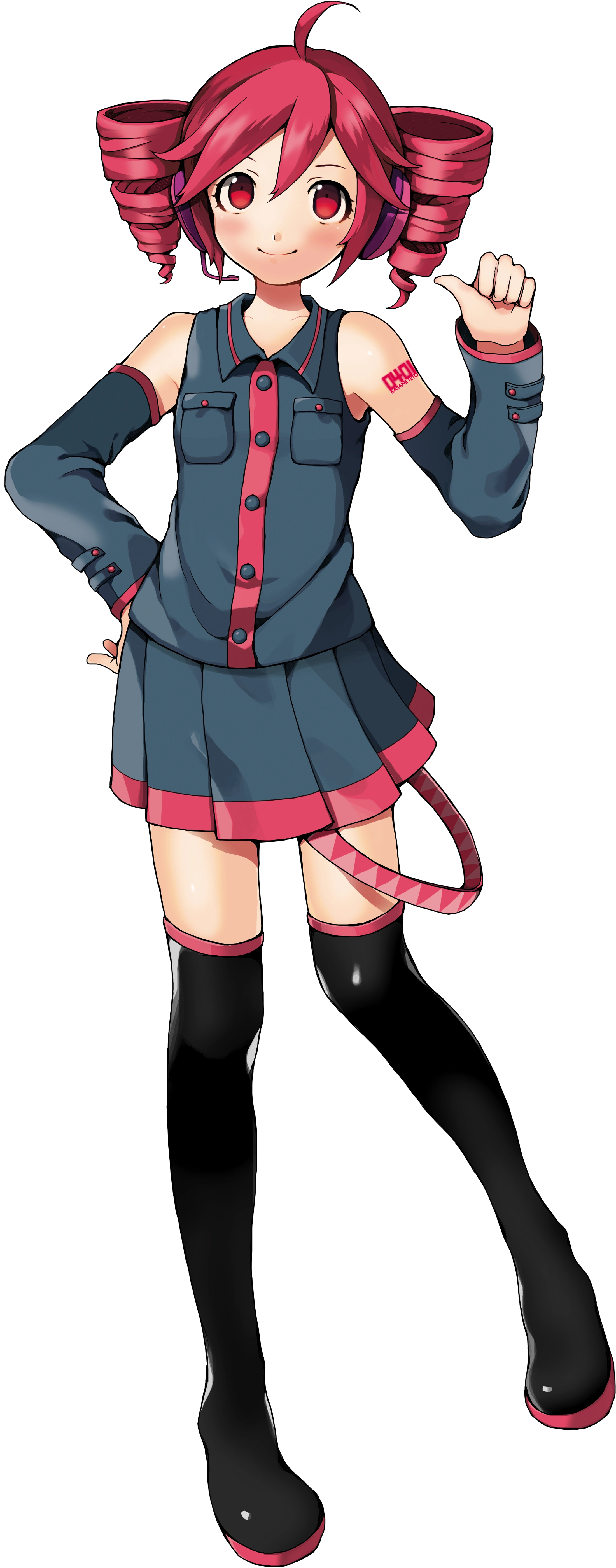 Color de pelo: Rojo pasando a rosa, su cabello está recogido en un par de coletas (simulando lo que sería Hatsune Miku) pero con la habilidad de ser usados como taladros, idea que surge de su cabello arremolinado.