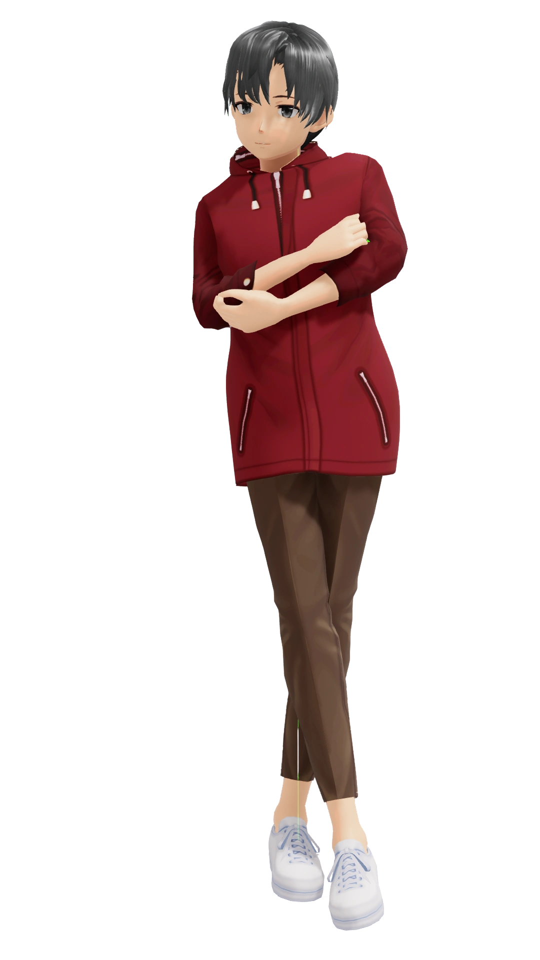 Vestimenta: Pantalón cafe, tenis blancos y chaqueta roja.