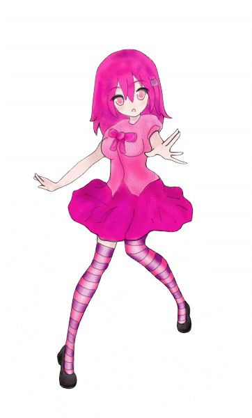 Elle a des cheveux roses ainsi que des yeux rosées. Une petite couette à couleur violette lui tient une de ses mèches à sa gauche. Elle est habituellement habillée d'une chemise rose bonbon surmonté d'un nœud papillon magenta. Elle possède également une jupe magenta et des collants à rayures roses-violettes. Ses chaussures sont des ballerines à talon noires. Elle mesure 1m60 pour 44 kilos. Au niveau du caractère, cette petite touffe rose est très timide mais aime la vie. Son aliment préféré est le donut: elle pourrait en manger indéfiniment et sans faim. Elle adore tout ce qui est mignon et plus principalement les pandas. D'ailleurs, son item est un parapluie à tête de panda de couleurs bleu et magenta.