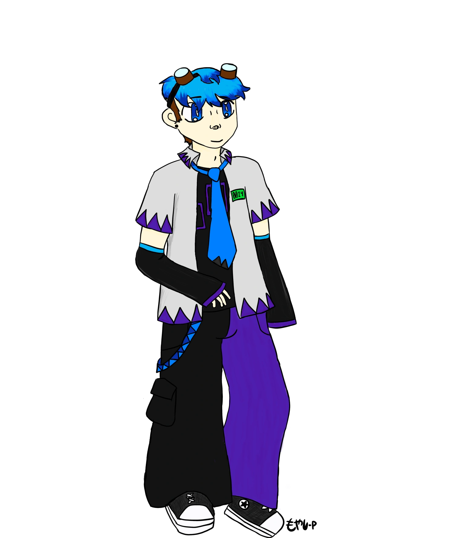 - Outfit: Brown goggles, a light gray button up shirt with purple triangle trim, a black undershirt with purple outline squares, black and purple cargo pants, a blue side belt, black with purple trim socks, black Converse, black arm warmers with blue and purple trim, and a blue tie. (so much detail)