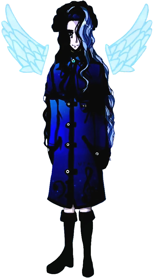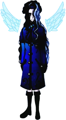 - Description: Long black hair with a large blue streak, black eyes, and floating light blue feathered wings.