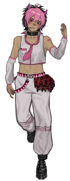 - Outfit: Grey sleeveless button-up crop top with pink lining, pink tie, black pants with half a black and red checkered skirt attached at the belt, pink and red belt with X-shaped buckle, platform black boots with pink lining, magenta horned headphones with purple X and square shapes on the inside, grey arm warmers with pink lining, spiked choker, and a pale bandage across the nose bridge.