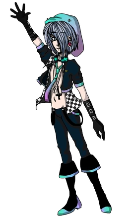 - Outfit: A dark blue jacket over a checkered undershirt, a teal and magenta tie, dark blue pants with black suspenders, black boots with teal and magenta soles, black gloves with buckles, and a teal and magenta beanie.