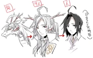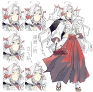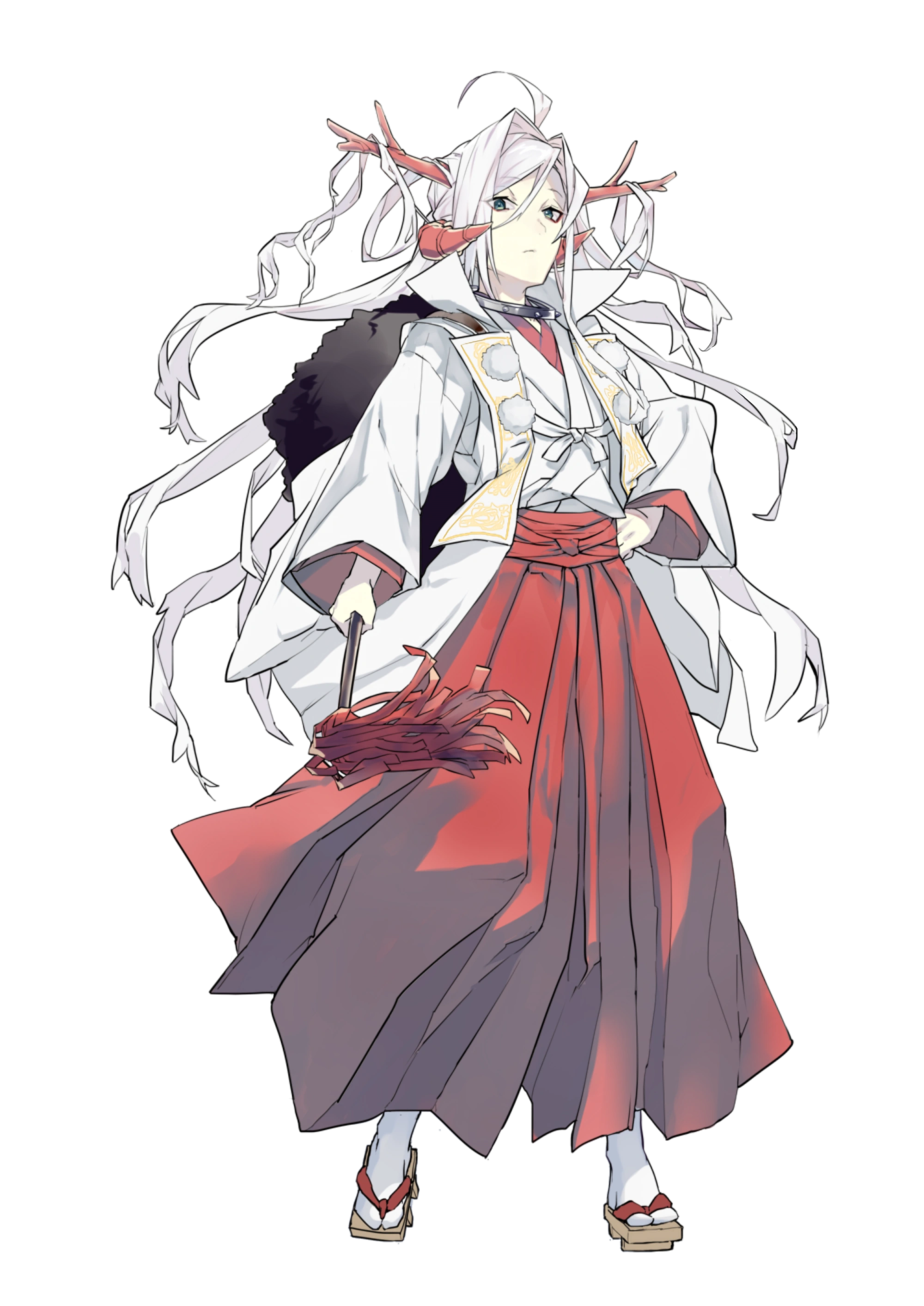The character has long, light silver-white hair tied in a knot and two red horns coming out of his head. His eyes are a very light olive color. He wears a costume similar to "Yamabushi".