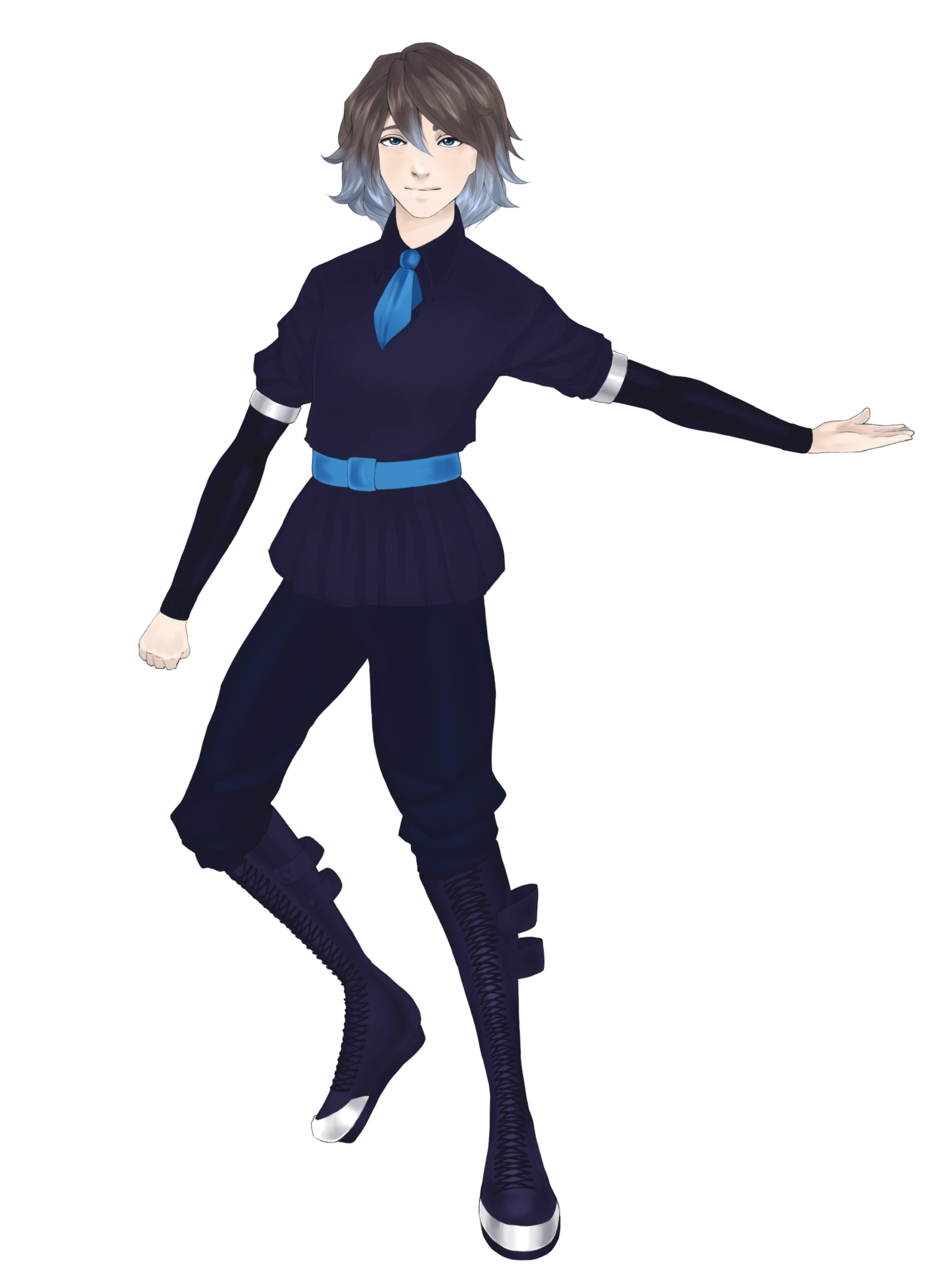 - Outfit: Wears a dark purple trousers and a shirt with a short blue glowing tie, metal cuff and black sleeves. Also wears a chunky blue belt with a metal buckle with a drop emblem on it, connected to the belt are high boots with blue glowing accents and soles.