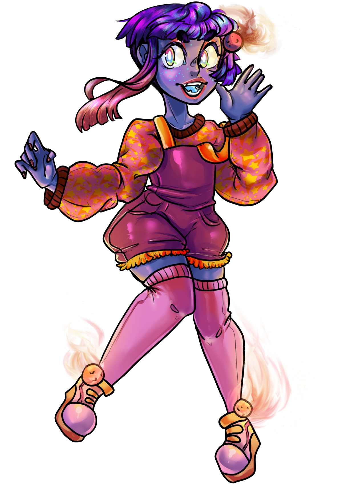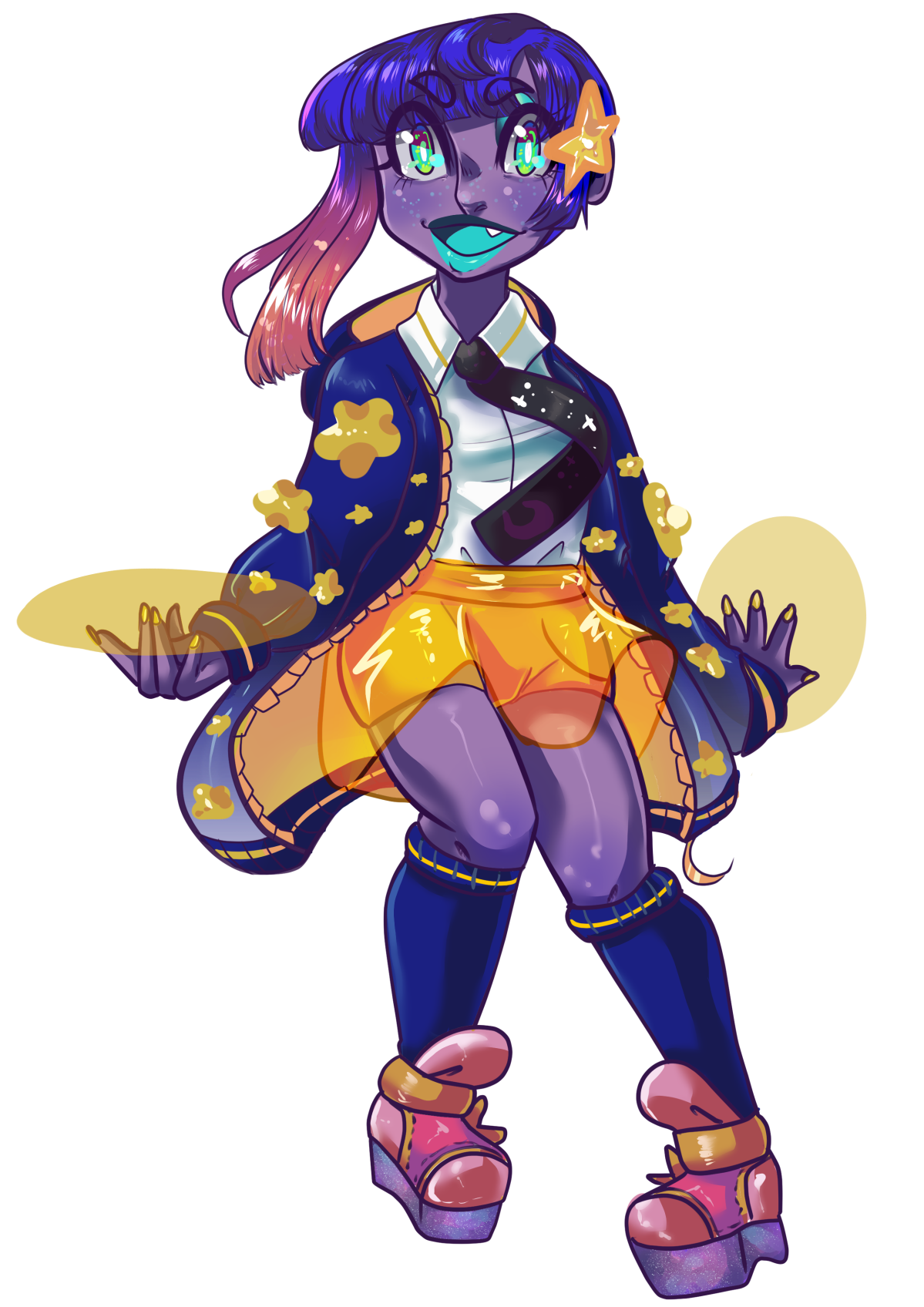 - Skin tone - Lilac with naturally dark blue blush/tongue/gums/lips and eyelids. They tend to wear heavy eye makeup and lipstick. Has cyan star-shaped freckles on their cheeks and the bridge of their nose that glow in the dark. Has cyan gills on the sides of their torso that also glow in the dark.