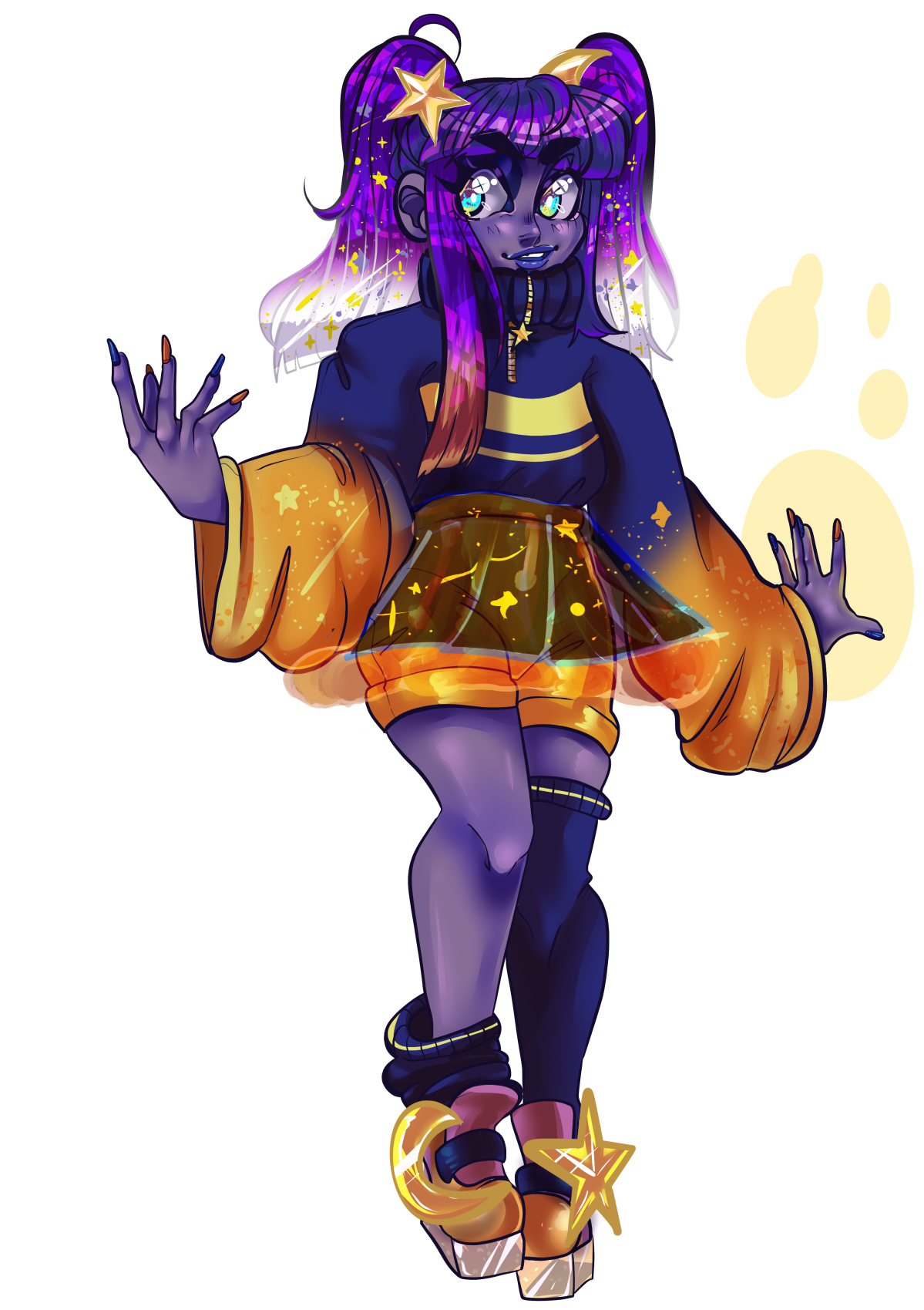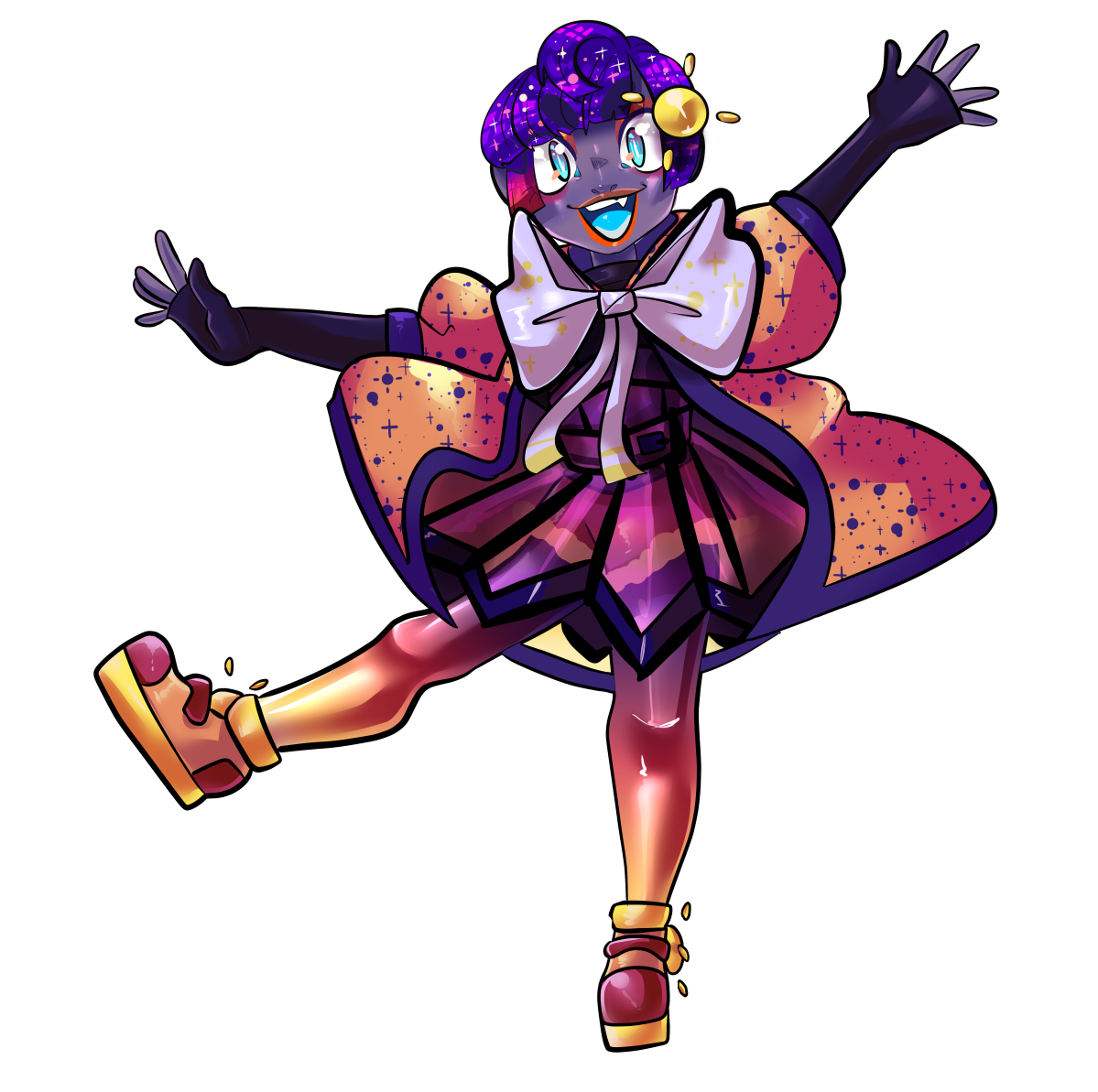 - Hair color- Tends to be a deep violet with a pink to orange starry gradient on their right side bang. Their English banks have a violet to pink to clear/glassy starry gradient hair. Their -cygnus- bank has a deeper sunset starry gradient on their bangs. It's unknown if these are wigs or not.