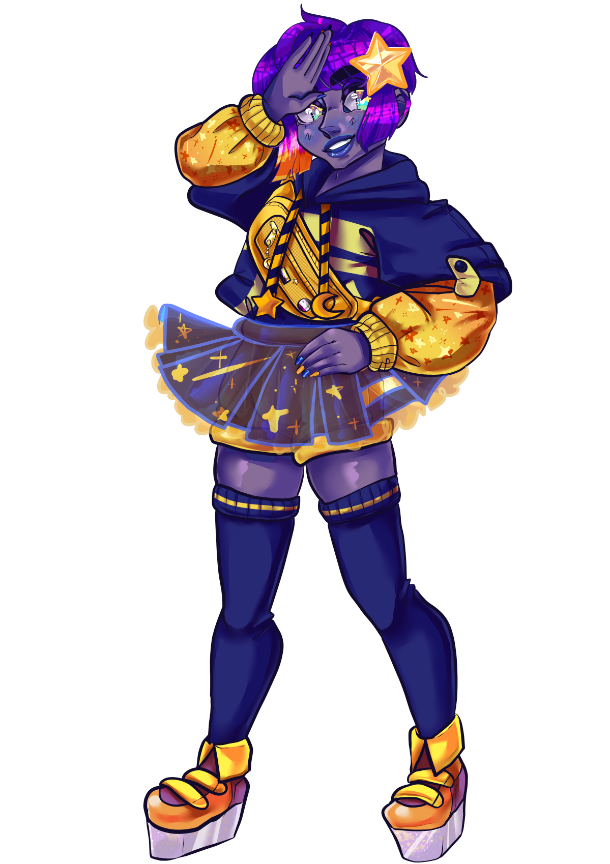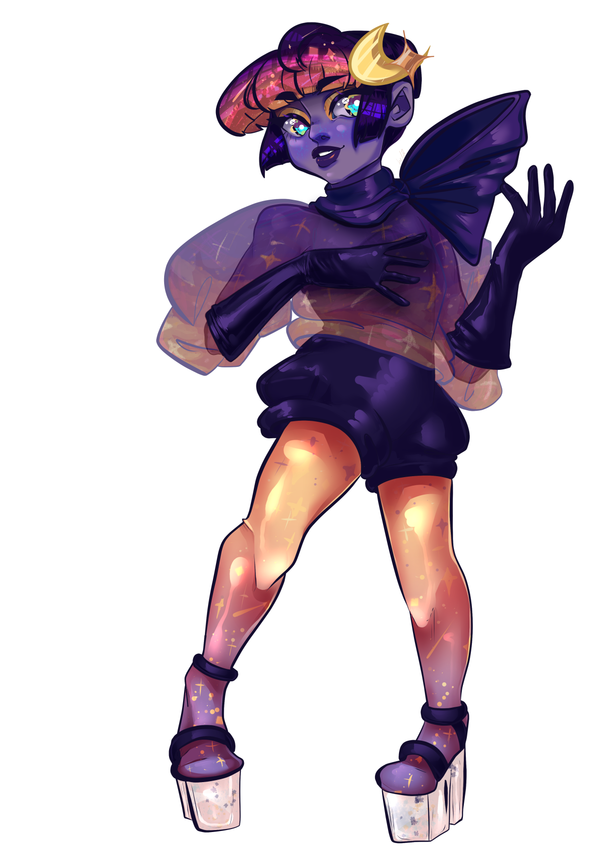 - Build- Very short, slightly curvy with a flat chest. Drawing them with other body types is fine as long as they remain flat chested. Tends to always wear platform shoes to make up for their short height.