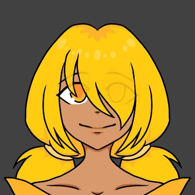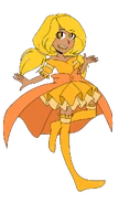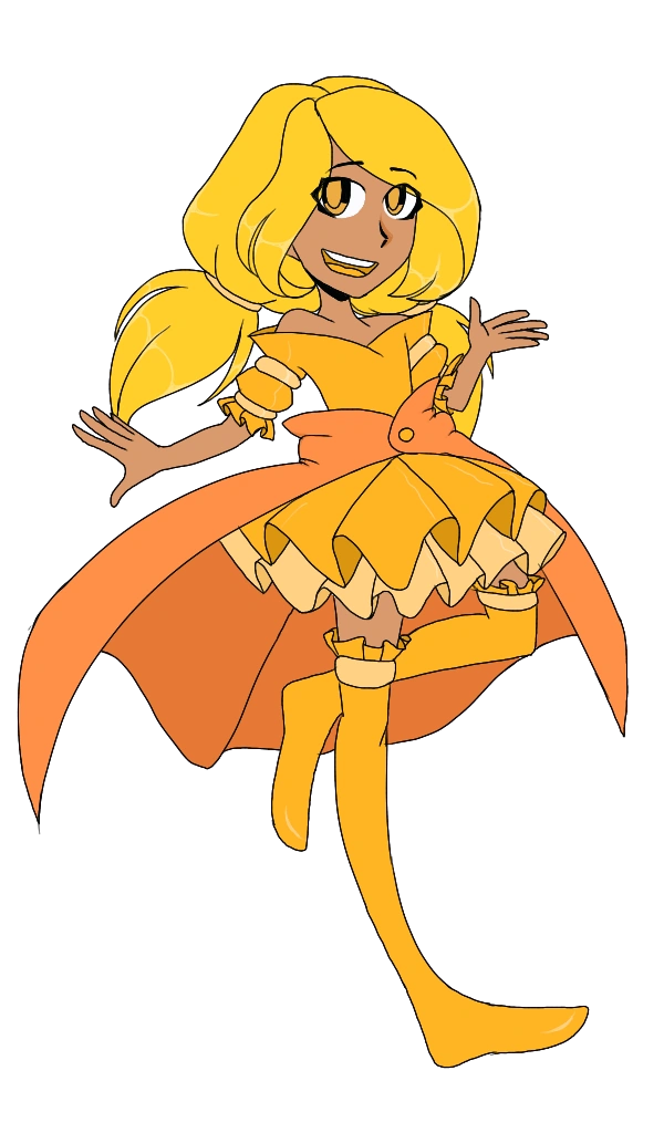 - Description: A girl of medium height. Hair - yellow, gathered in two lush tails; eyes - yellow, skin - dark.
