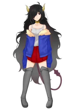 She has long slightly wavy black hair with bangs covering half her face and horns with brown eyes.