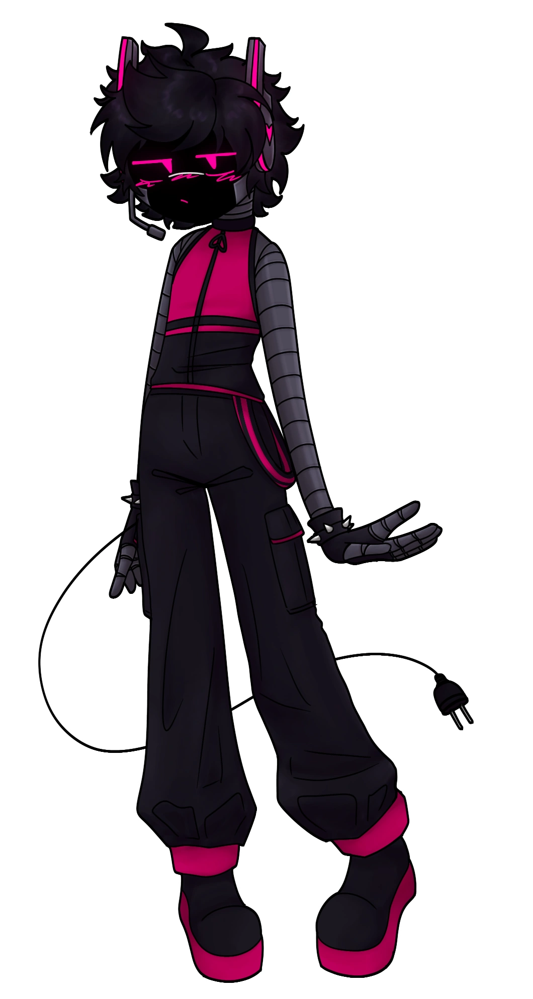 - Physical Appearance: CYAN is a fairly tall robot with an electrical plug tail and antennae-like headphones with heart-shaped lights on the sides. Their hair and screen face are both black, and their eyes/mouth are displayed in hot pink. They wear a black sleeveless turtleneck top that zips up in the front. The zipper is in the shape of an upside-down heart and half of the top is dark pink. They also wear black cargo pants that are the same shade of pink at the bottom-- the same colours apply to their boots. They have black fingerless gloves with spiked cuffs.