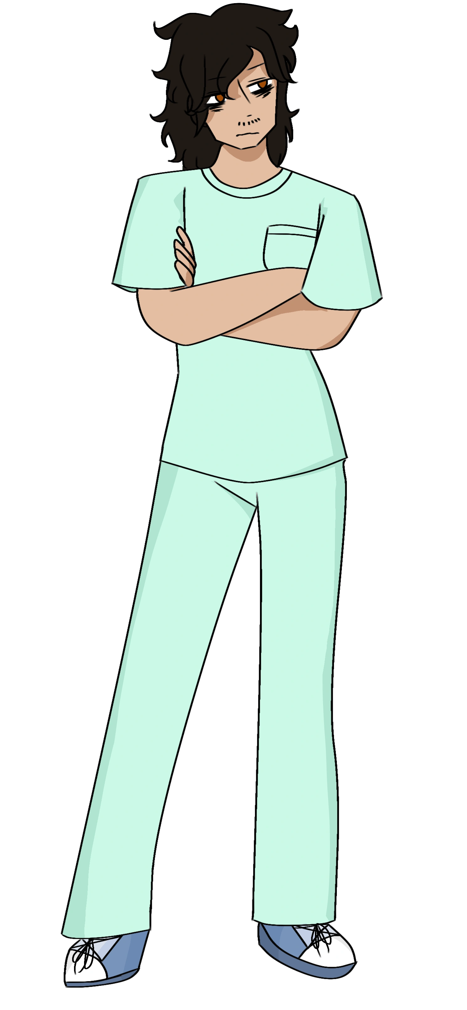 - Outfit: Teal scrubs and blue sneakers (when permitted)