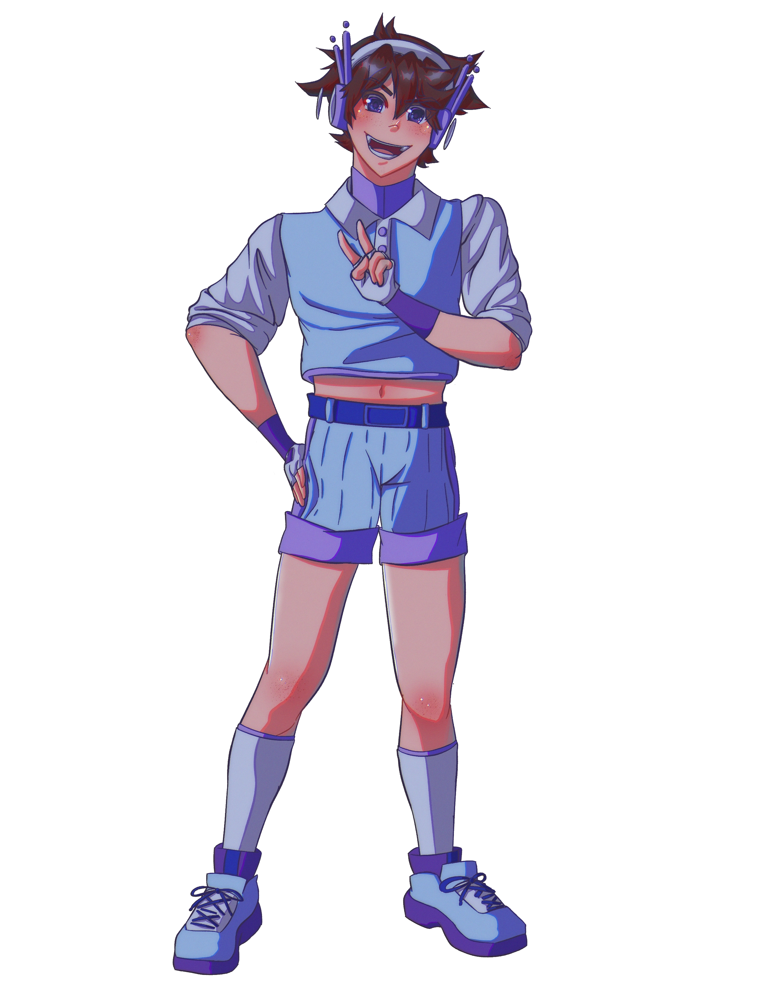 - Outfit: Wears a dark blue undershirt with a long collar. On top of this is a themed light blue vest. Along with this, he wears dark grey shorts with a bright purple belt, along with similarly colored gloves. Daiki is also adorned with large clownish shoes as well as uneven themed socks. He wears a hi-tech pair of headphones on his head.
