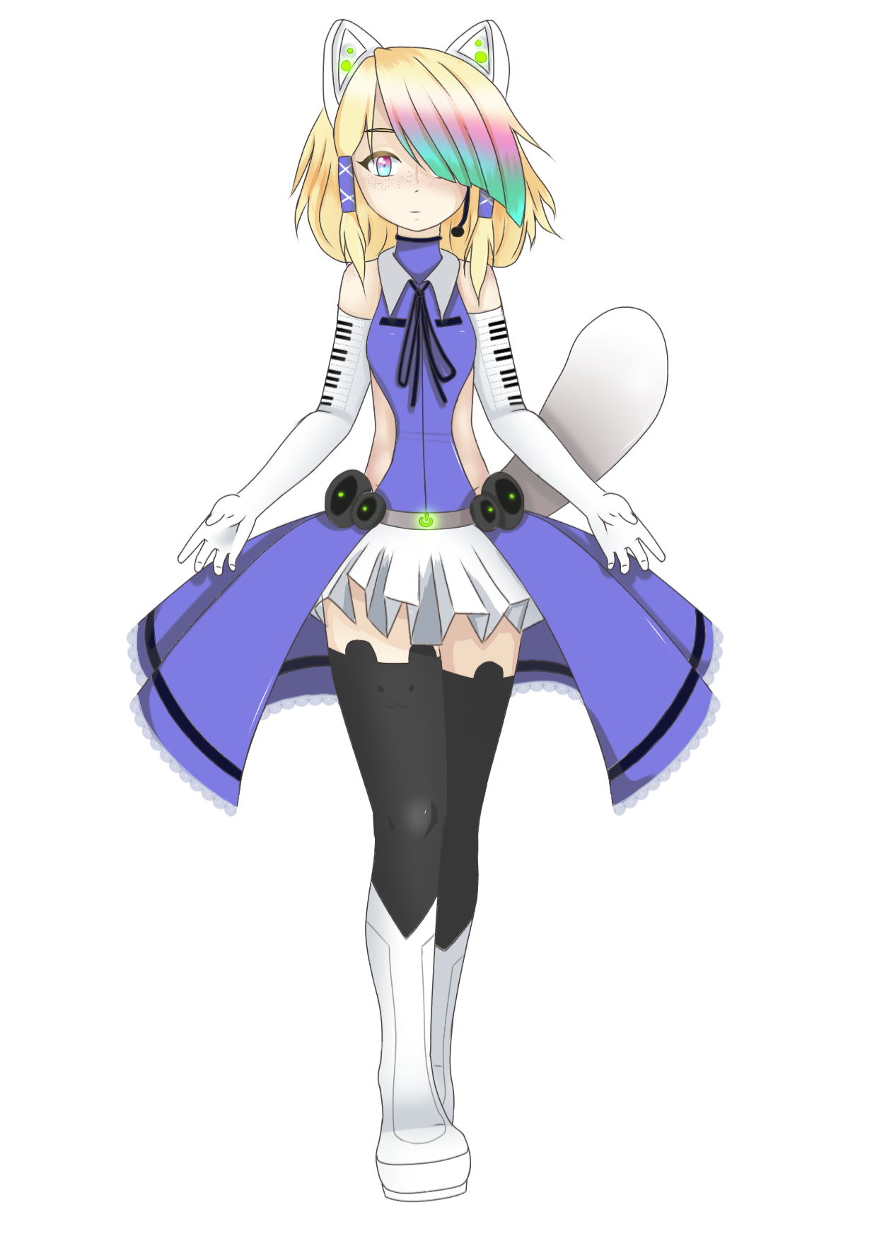 - Description: Hair color - Light blonde with various pastel shaded streaks; styled in a thick and wavy bob cut with long asymmetrical bangs. Eye color - Pastel pink / yellow.