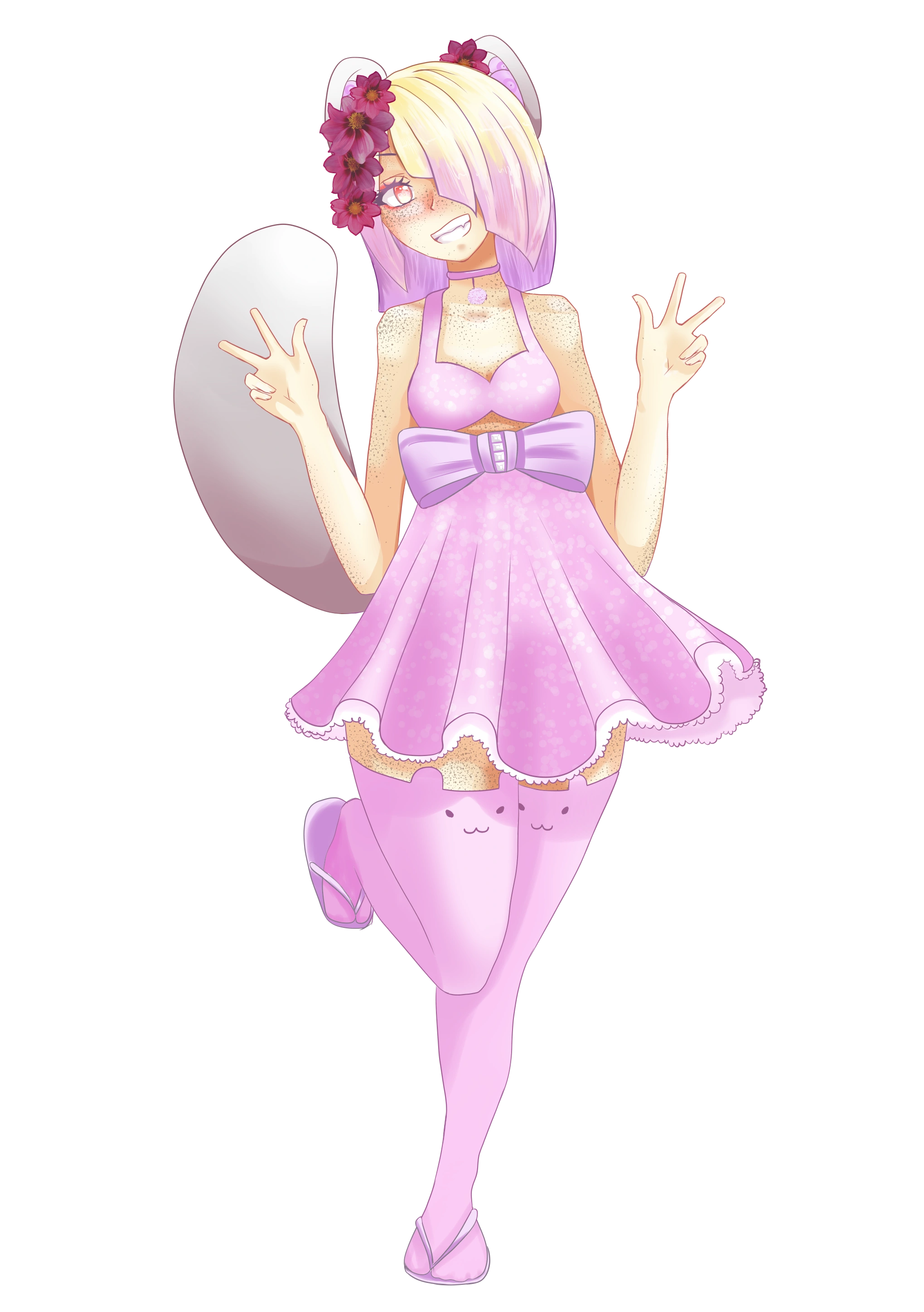 - 誠音デージーV3 - MILD: A pink dress with a translucent white polka-dot pattern featuring a sweetheart neckline and cutout, thick straps, a circle skirt with a fluffy white petticoat, and a purple bow directly under the bust with rhinestones on the tie, pink stockings with animal ears and faces printed on the front of the thighs, purple thong sandals, a purple choker with a pink dangling pom-pom, and dahlias worn in hair.