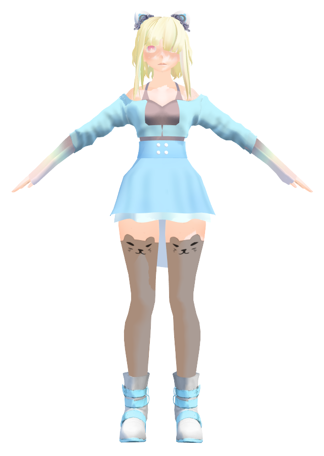 - 誠音デージーV2: Muted pink knuckle-length sleeved top with thumb holes and a pastel colored gradient on the sleeves; light blue pleated skirt with a fluffy white lining and matching short-sleeved off-the-shoulder hoodie; muted brown stockings with ears and animal faces printed on the thighs; white boots with light blue straps and matching hair accessory; light blue and gray speakers worn in ears; mint polka-dotted bow necklace