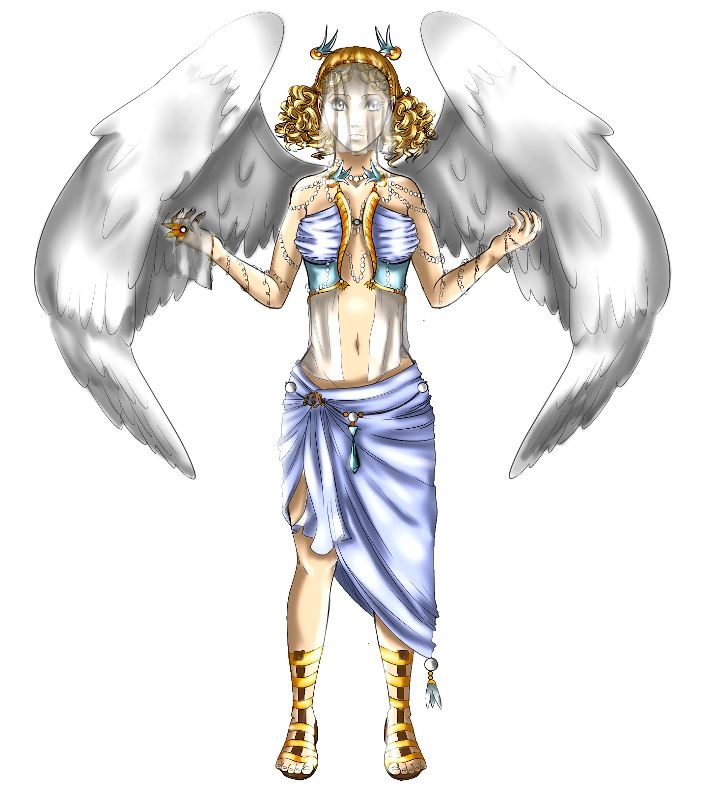 - Outfit - Blue corset piece with gold pieces, white veil, and blue long skirt