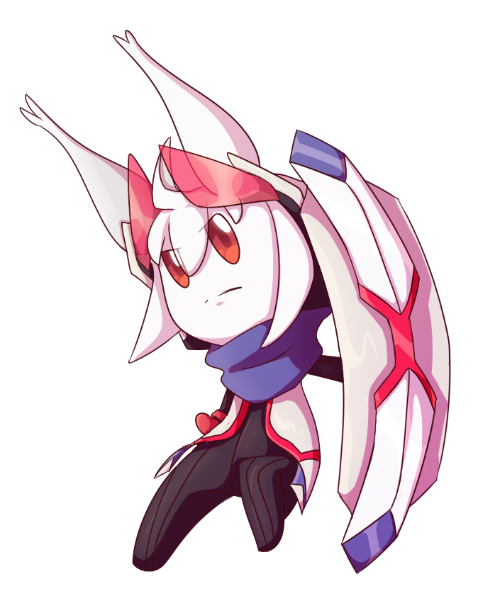 - Outfit: White and black headset with pink visors, blue scarf, grey-black suit, white armor, pink armor gloves, white shield.