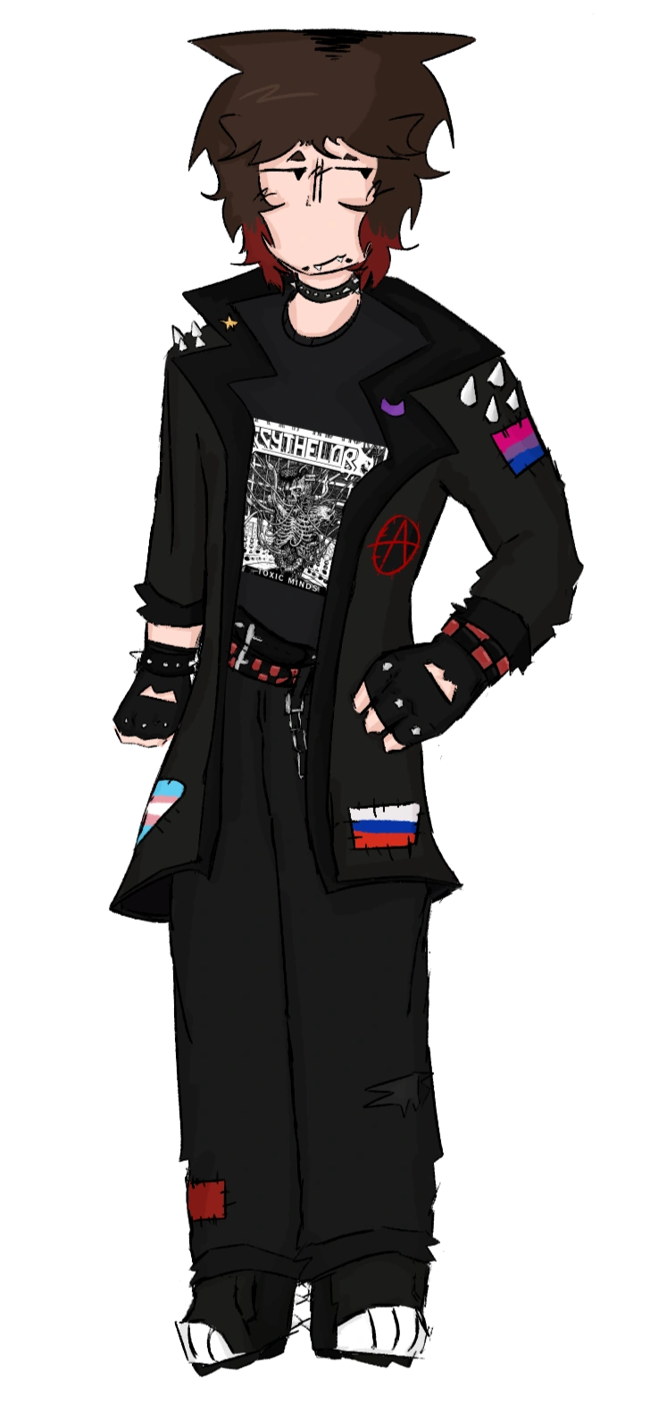 - Outfit: Battlejacket with various patches, and spikes on the shoulders, Spiked collar, Scythelord T-Shirt, Spiked wristband on his left arm, black and red studded wristband on his right arm, Fingerless gloves, Spiked belt, Black and Red studded belt, Black baggy-ish pants with a red patch on them covering up a tear on the bottom of the left leg, a hole on the right leg made on purpose, and combat boots with cat paws painted on, and spikes on the back of them. He also has a chain, but I'm unsure how to describe that.