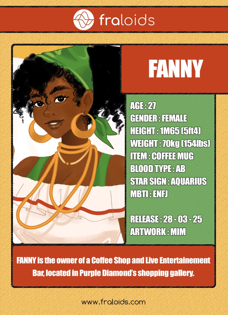 FANNY is the owner of a café-cabaret located in Purple Diamond. She is also the Wife of FLORALYS.