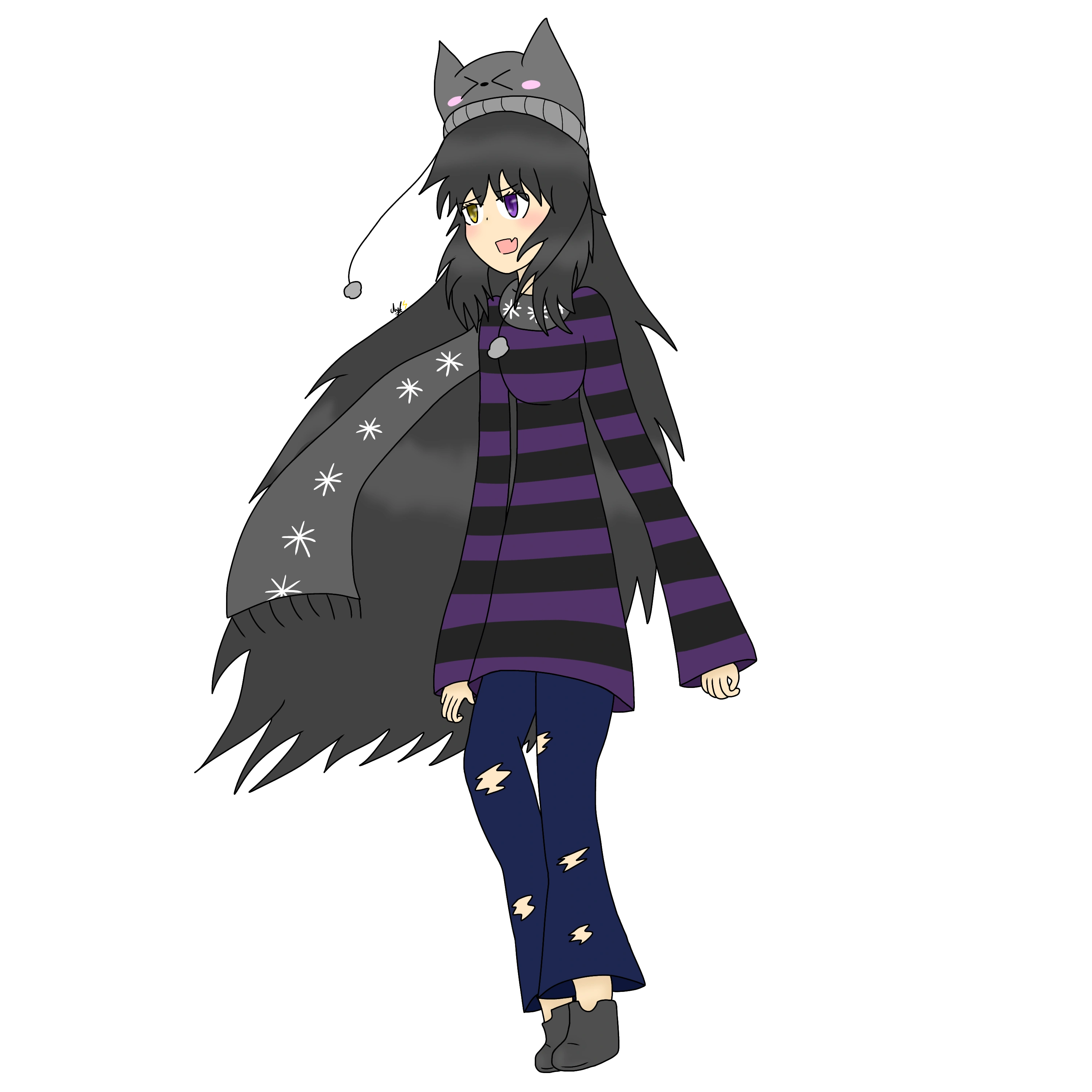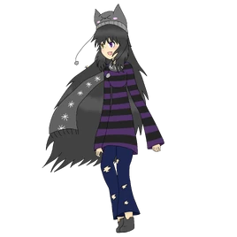 - Outfit: Wears a moving-ear pull-down grey wolf hat almost everywhere (unless she feels the need to take it off). Has long, straight, waist-length dark grey hair, and wears a purple sweater with ebony stripes, along with dark blue ripped jeans. Wears a dark grey scarf with white snowflakes around her neck. Has heterochromia (right eye is yellow, left eye is purple). Sometimes carries around a yellow scythe.