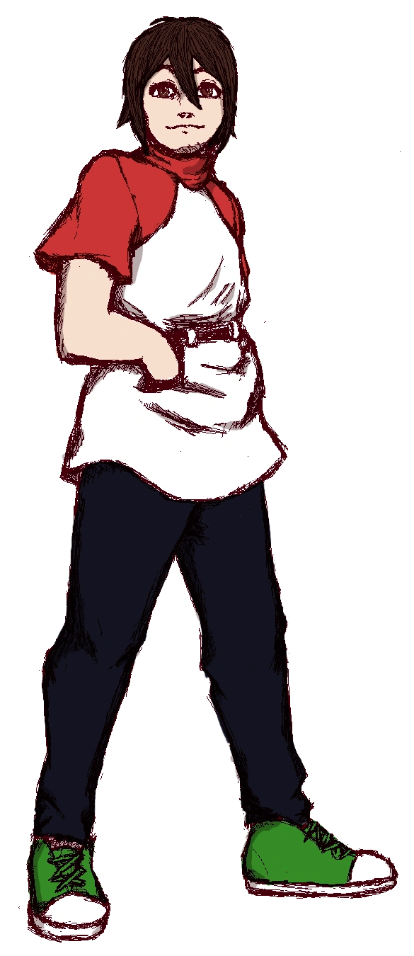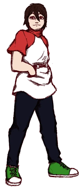JD is a young man with neck-length short brown hair with split bangs and brown eyes. He wears a long white sweater with red short sleeves, shoulder sections, and collar. The collar itself is wide and its height is nearly up to his chin. Over the jacket is a black belt. He wears long black pants and his shoes are green sneakers.