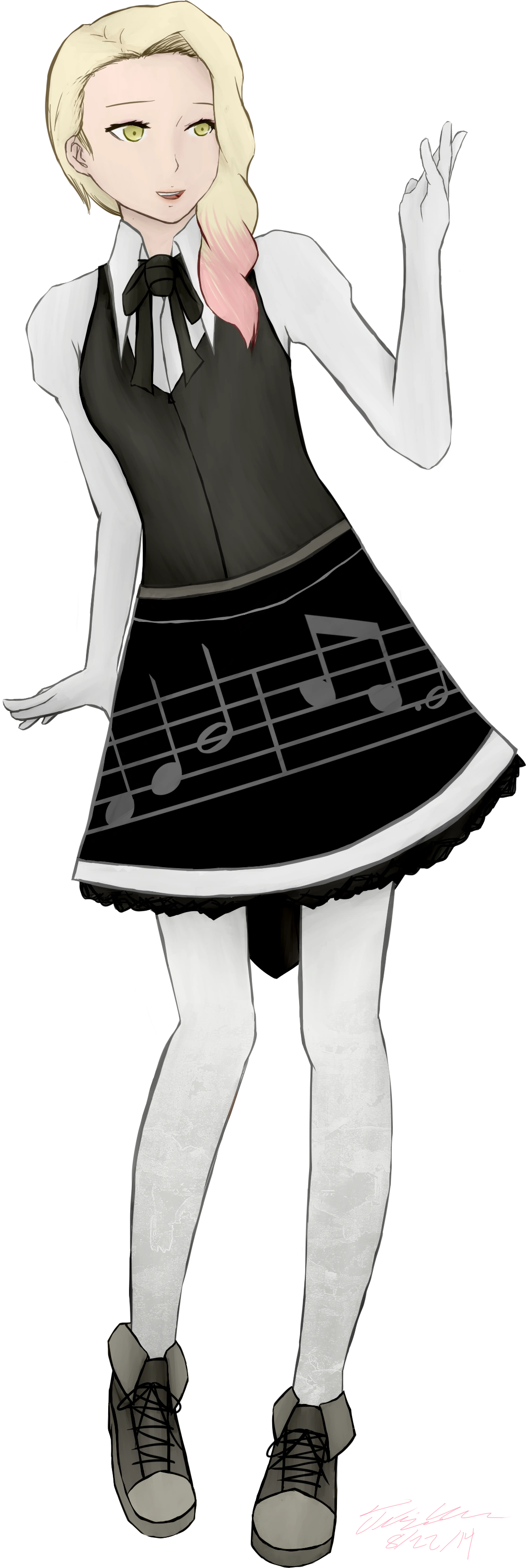 Skirt: Mainly black tiered skirt that reaches halfway down her thighs; layered with grey lace and a tail that reaches the knees. A light grey musical lines and notes wrap around the skirt as a pattern.