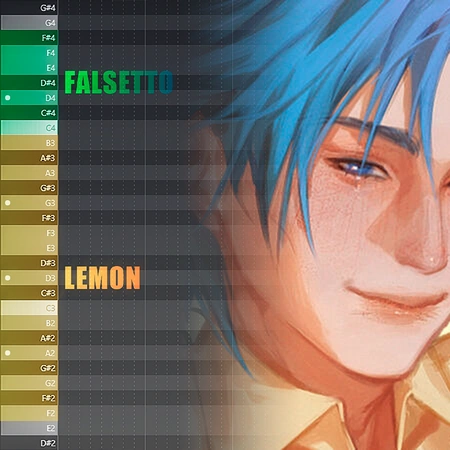 ● A2, D3, G3 ● D4 (falsetto) use suffix F for falsetto (- あF) | |