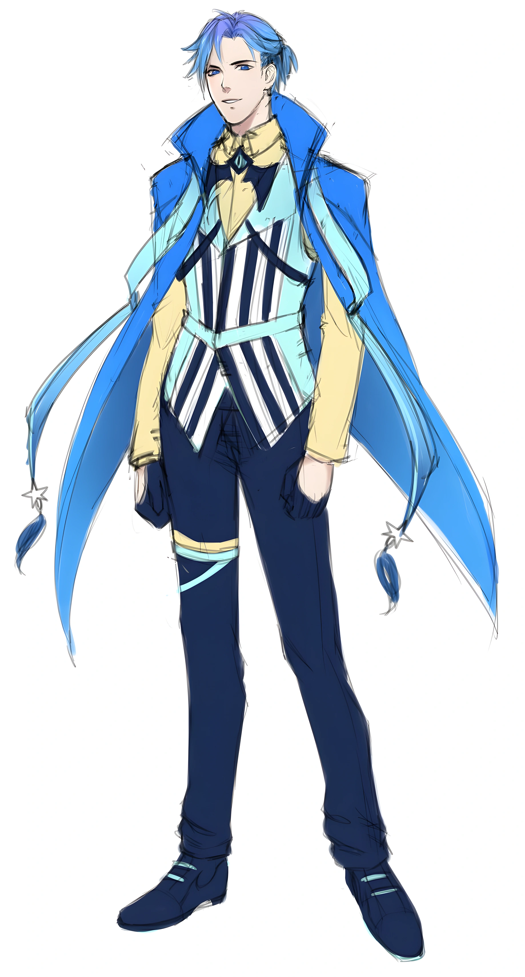 - Outfit: His main clothes are a pastel yellow shirt and dark blue trousers. He is usually depicted in a light gray vest with dark blue and white stripes. He also wears a blue cape and two ribbons around his leg.