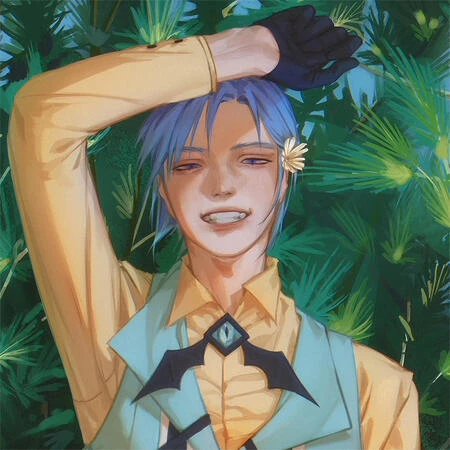 - Hair: The hair color is blue, the roots have a gradient in purple. His hair is pulled back in a ponytail, but his bangs are still hanging loose.