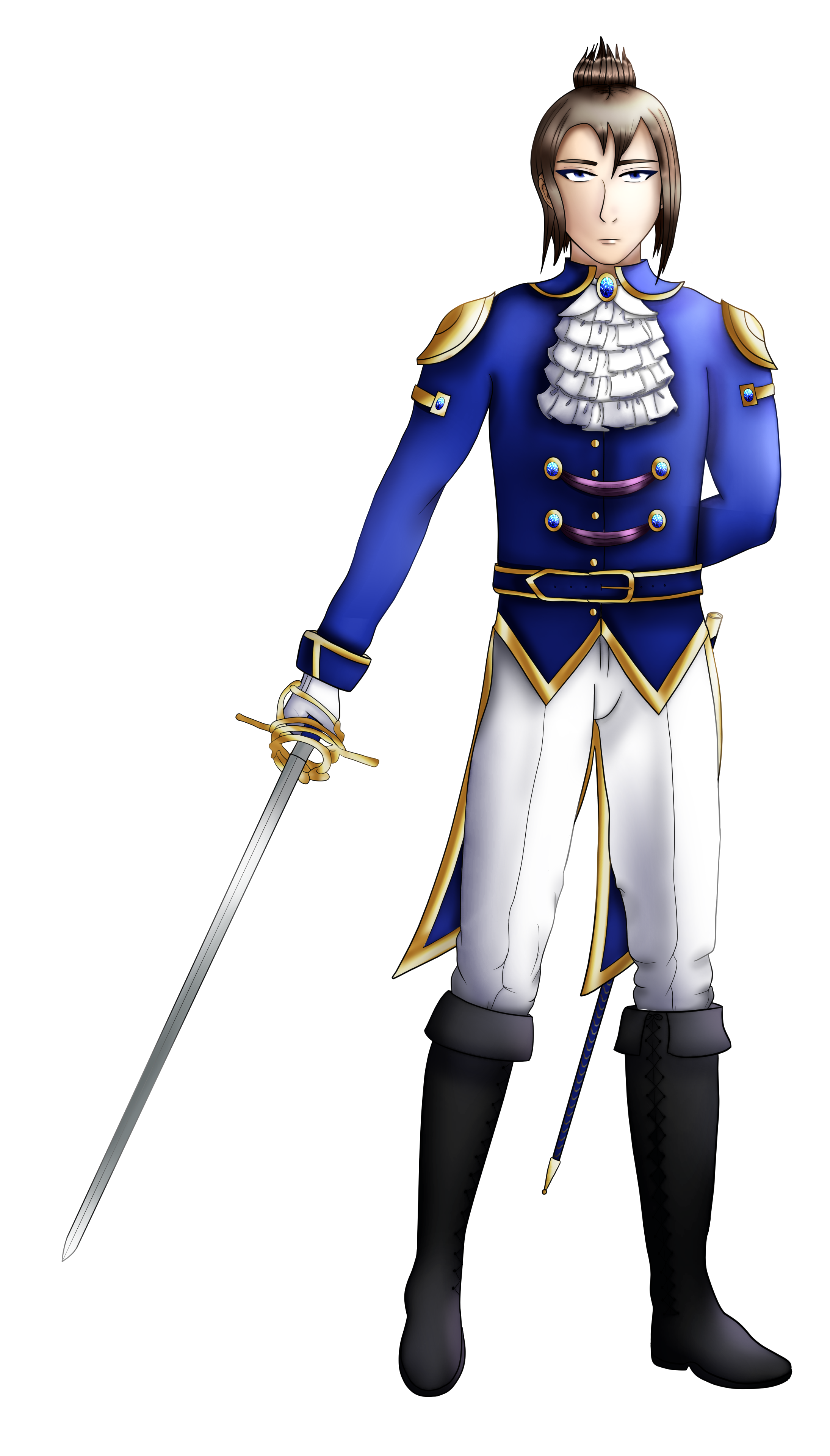 - Outfit: Kishin is pretty much never seen, not wearing his official royal uniform. He wears his family’s garment with pride and a sense of responsibility, knowing he constantly represents the prestige and dignity of his noblehood. Prussian blue is the signature colour of the Ao Mugen family, the same hue his jacket is coloured in. Combined with golden refinements and sapphire gemstones, to give his garderobe an extraordinary high-class look. Purple ribbons and white ruffles complement his already elegant and elite aesthetic. He carries with him his rapière, stuck in an adorned scabbard Kishin wears at his belt, ready to use it in any given moment. His remaining outfit is held quite simple, consisting of white trousers and black boots barely reaching his knees. The length of his hair actually goes way beyond his shoulders, which is rarely seen as he usually pins it up with a clip matching his clothes. Although keeping it short would be more comfortable for him, he refuses to cut it. He does not state the reasoning behind this quite clearly. He is probably hoping for the day, when his little sister will plait his hair again. Kishin does not really like wearing any other clothing, especially if it’s plain or even low-quality. However, there are situations, where he can’t run around in public looking like a royal man, as it would draw unnecessary attention towards him. Therefore he has to compromise sometimes…unwillingly.