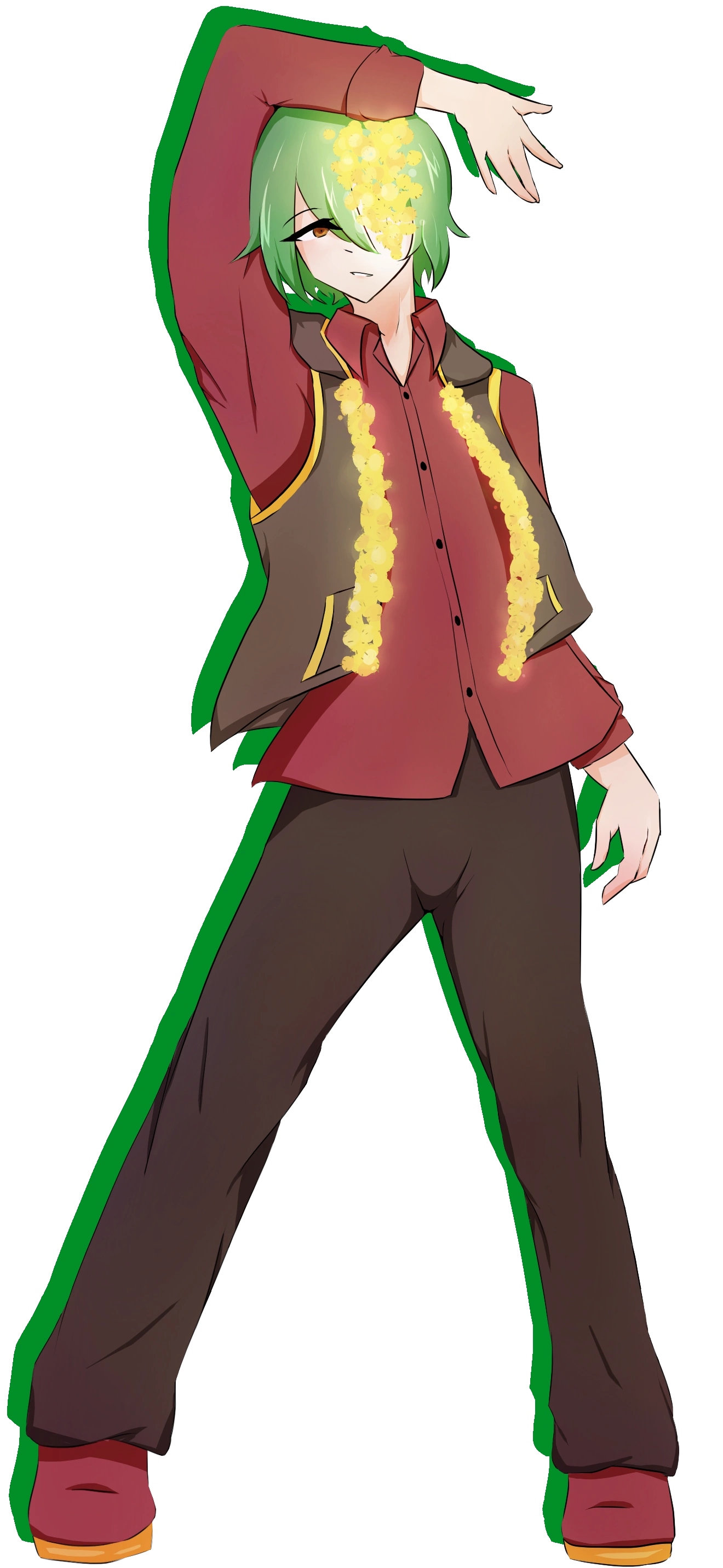 - Description: Designed around a floral theme. Green hair and a flower-shaped iris in his left eye.