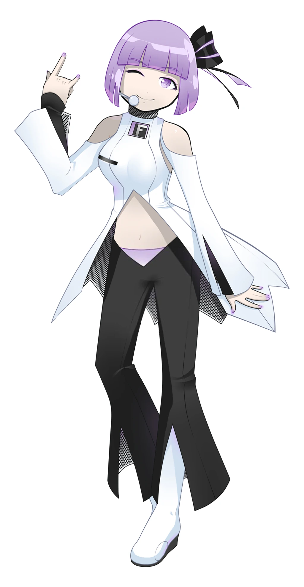 Head: Black bow with light violet stripes on the left side of her head. A light grey microphone is attached to her, resting by her mouth.