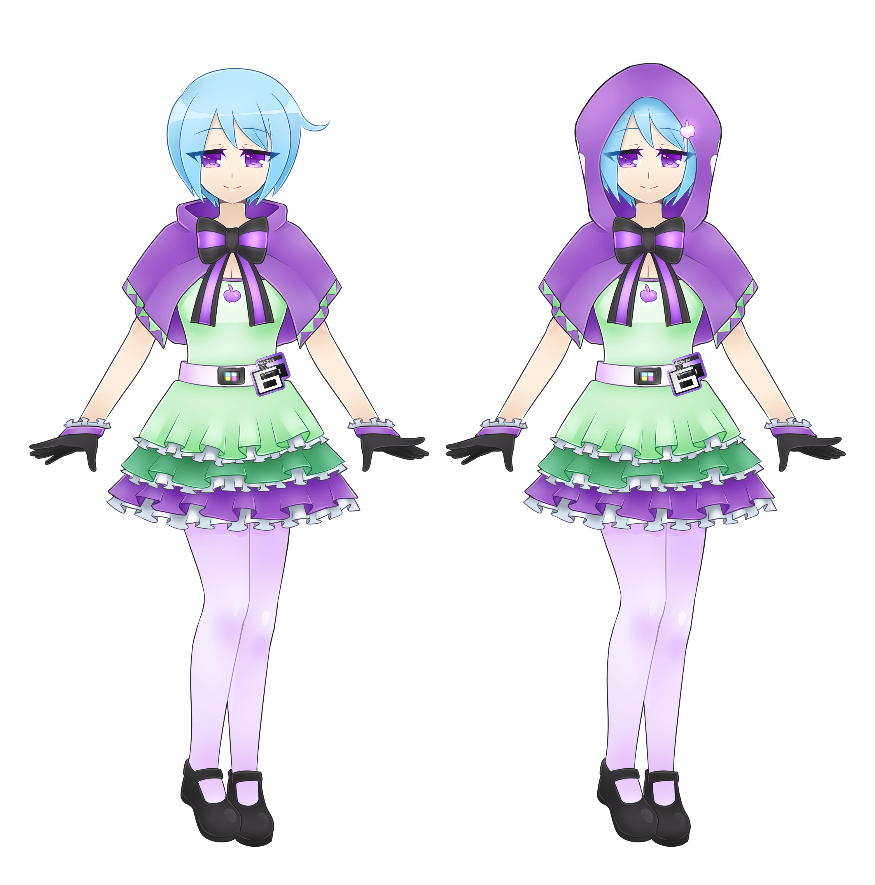 - Head: Violet floppy hat with a lavender ribbon around; Accessorized with a silver apple emblem.