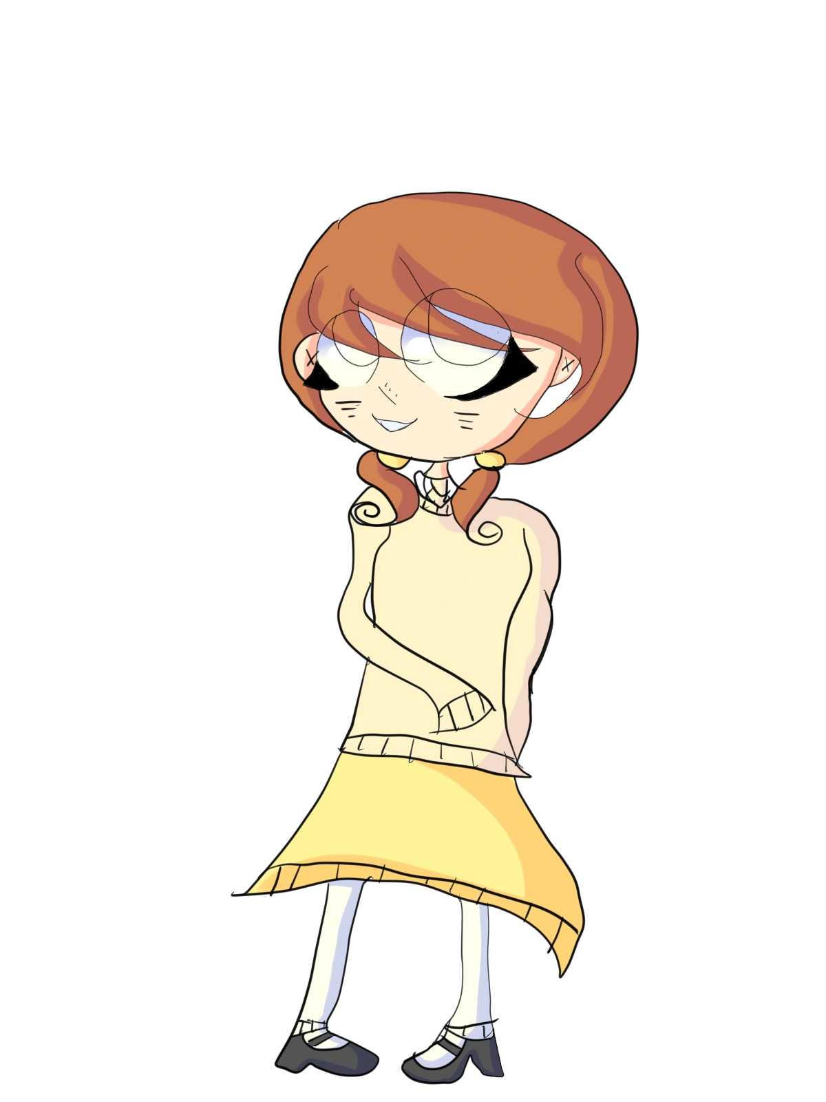 - Outfit: Yellow cardigan and skirt, white stockings, and black Mary-Janes