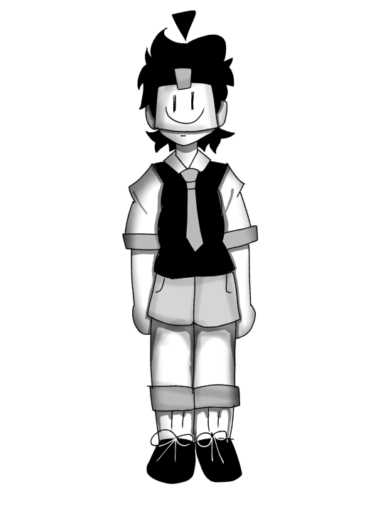 - Outfit: White shirt and shorts, black vest and tie. And taped paper with smile on face on his face