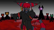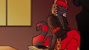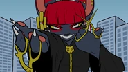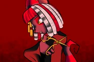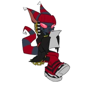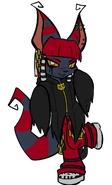 - Description: Blue and red fur coat. Red bangs, red, black and white dreadlocks. White eyes with yellow scelra. Crooked tail and ears that curl at the ends.
