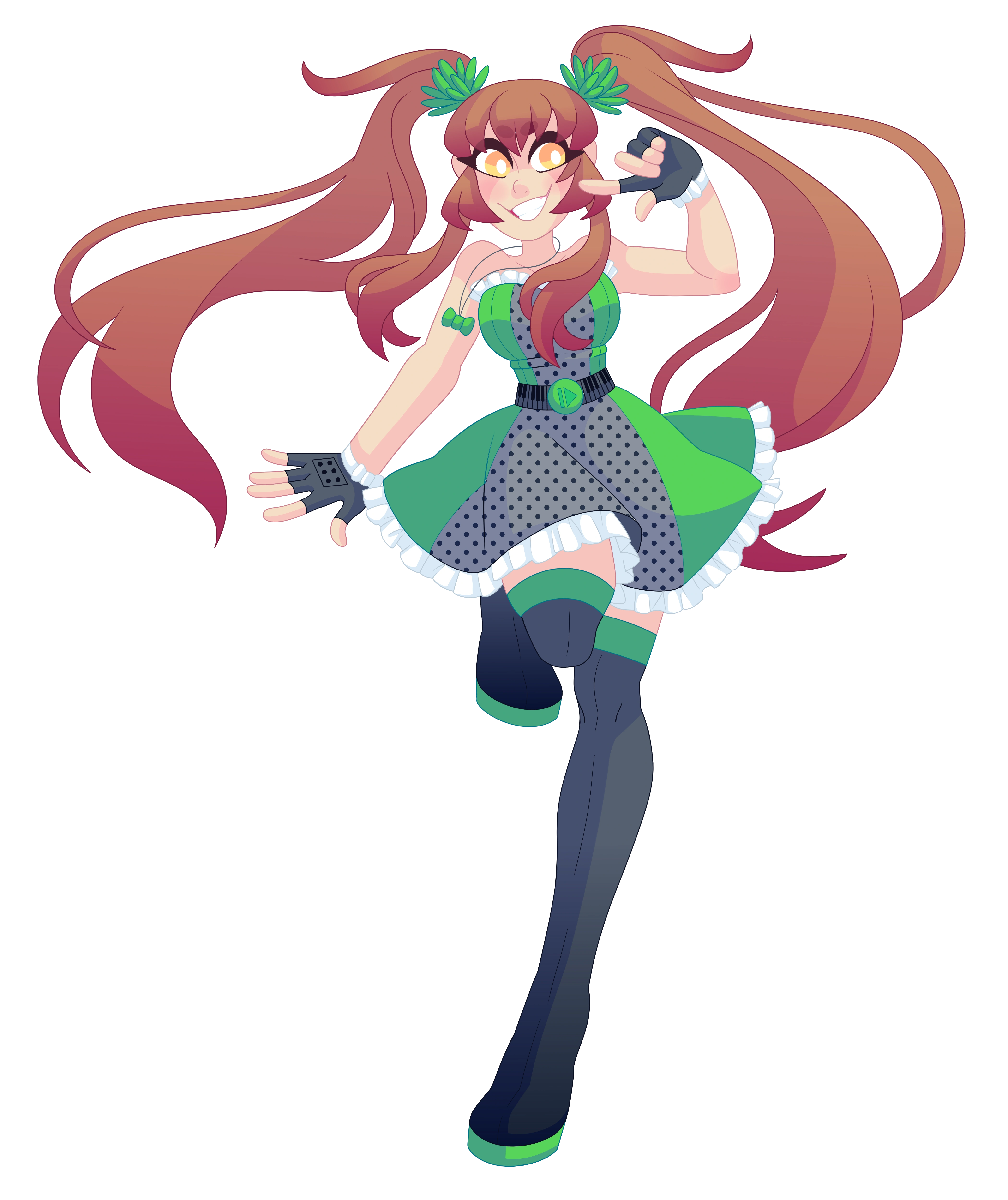 - Hair: Chestnut Brown, long twin-tails held together by green flower clips.