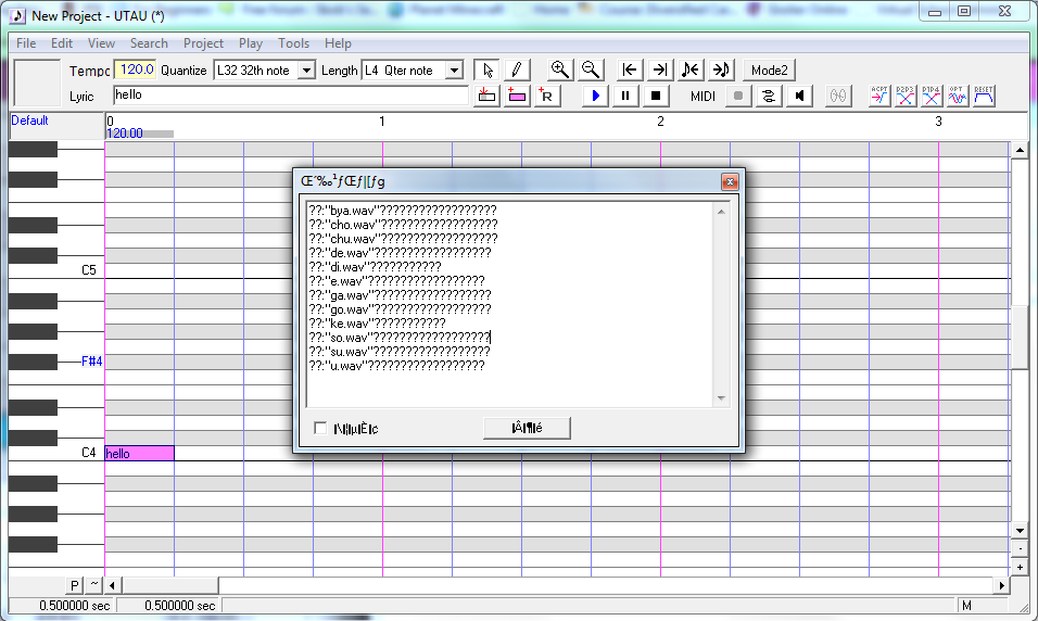 Hello i'm a bit new with UTAU and i need help ;A; , my problem is a downloaded the VCV voicebanks of Ritsu and tried to make her sing a VCV ust of course but she won't sing and also I dowloaded Desune Moralix Skype ( it's CVVC tripitch ) and i put her folder in the program a window appears and and the only thing that written is <<??????????>>