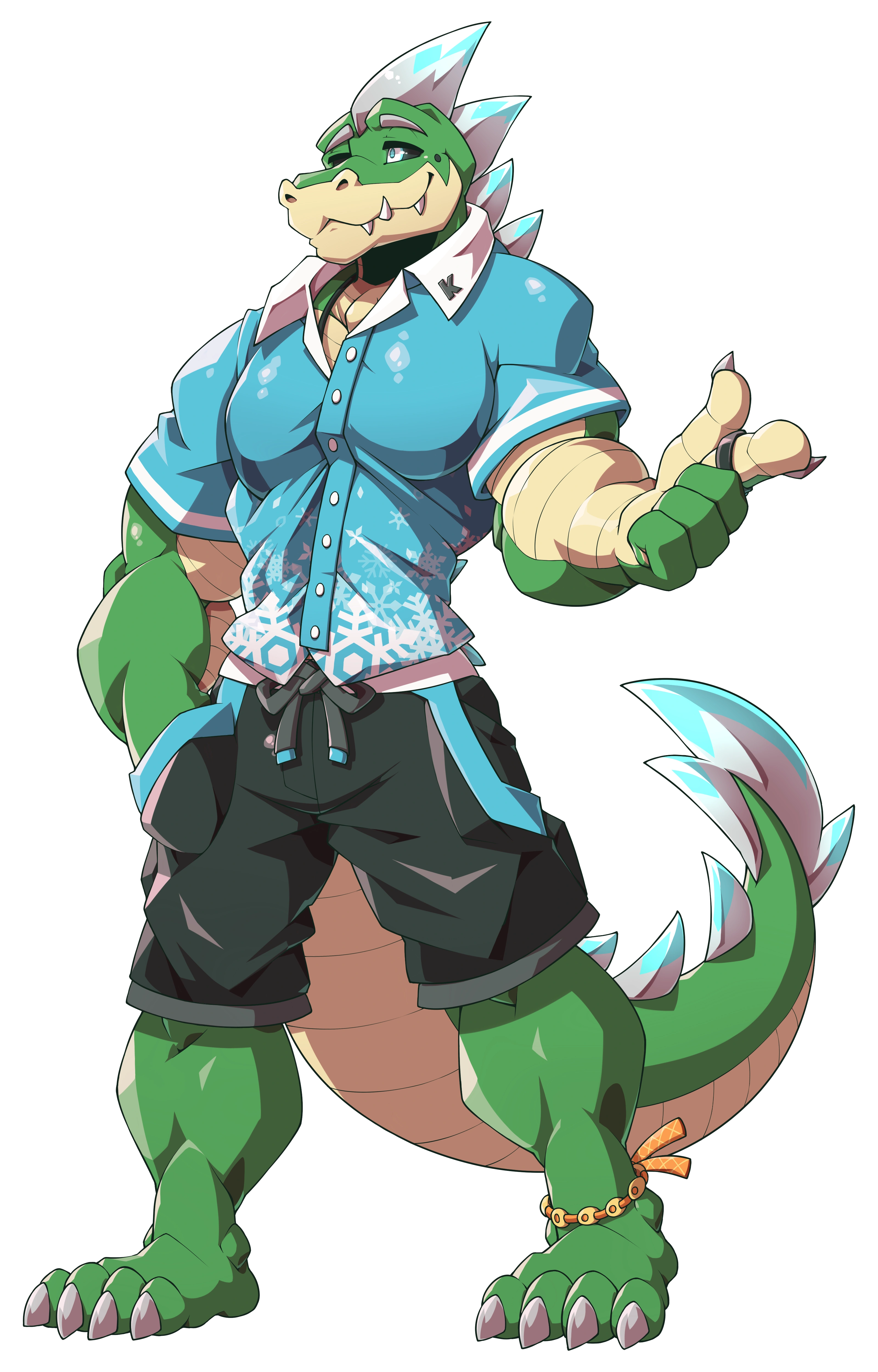 - Other - He has a big strong body, his skin is dark/light green and he has blue shines on his spikes and tail.